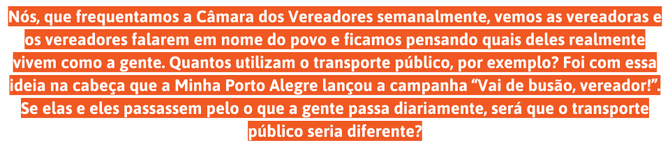 A nova iniciativa da Minha Porto Alegre quer testar como a teoria se aplica na prática. A Campanha “Vai de busão, vereador!” convidou toda a turma da Câmara para fazer uma viagem de bus, registrar o momento e bater um papo com a gente depois. Queremos que elas e eles saiam do ônibus loucos para colocar a mão na massa em prol de um sistema de transporte público lindo de se viver.